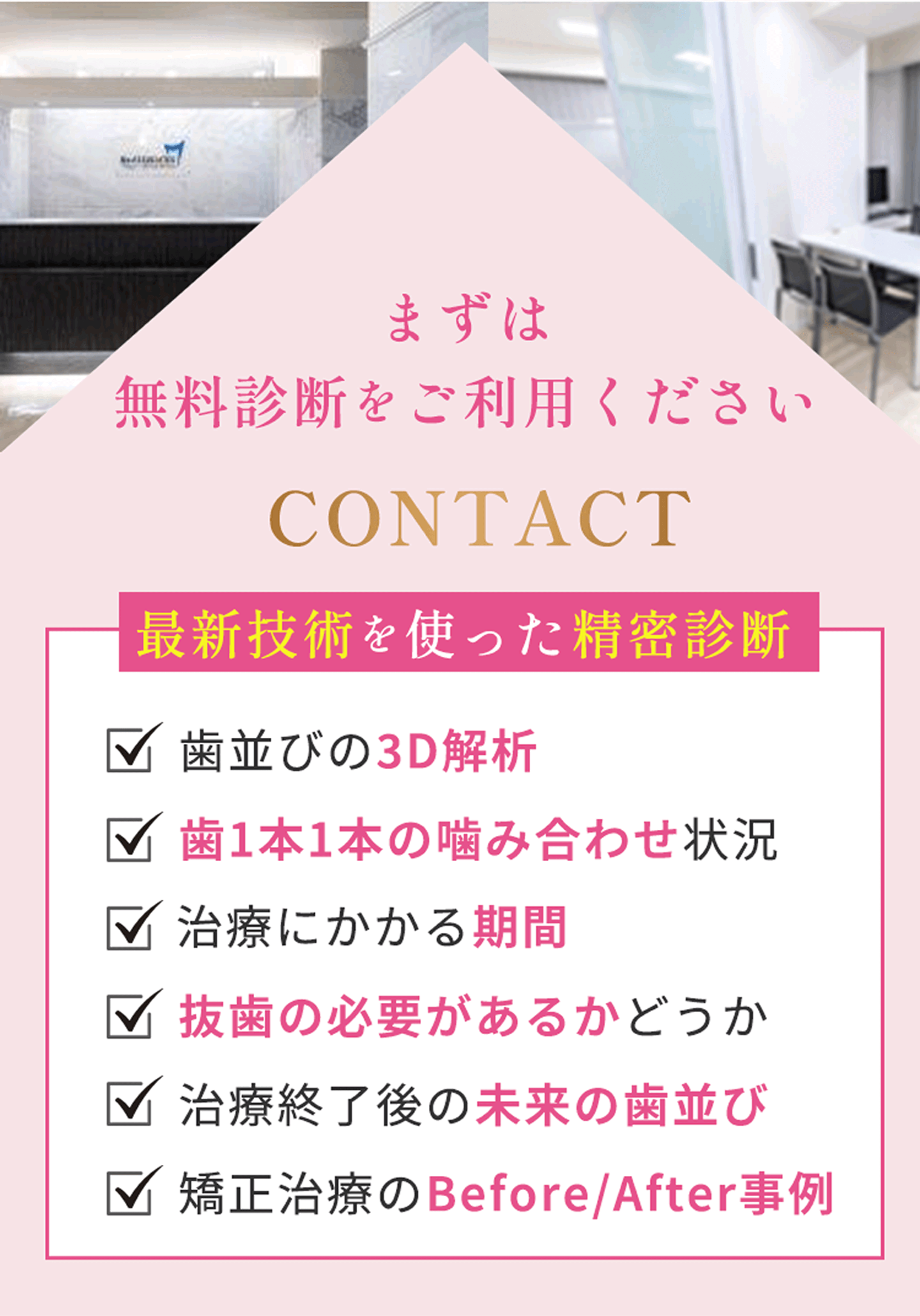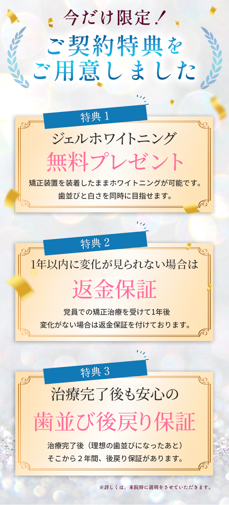 費用:73万円(税込)検査・診断断料、リテーナー費用を含む。症状の程度や治療内容により費用が変動します。