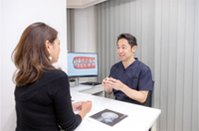まずは、実際にお口の中を拝見して、歯や歯茎の健康状態を把握するところから始めていきます。東京日本橋エムアンドアソシエイツ矯正歯科では初診カウンセリングを受け付けておりますので、お気軽にご相談ください。